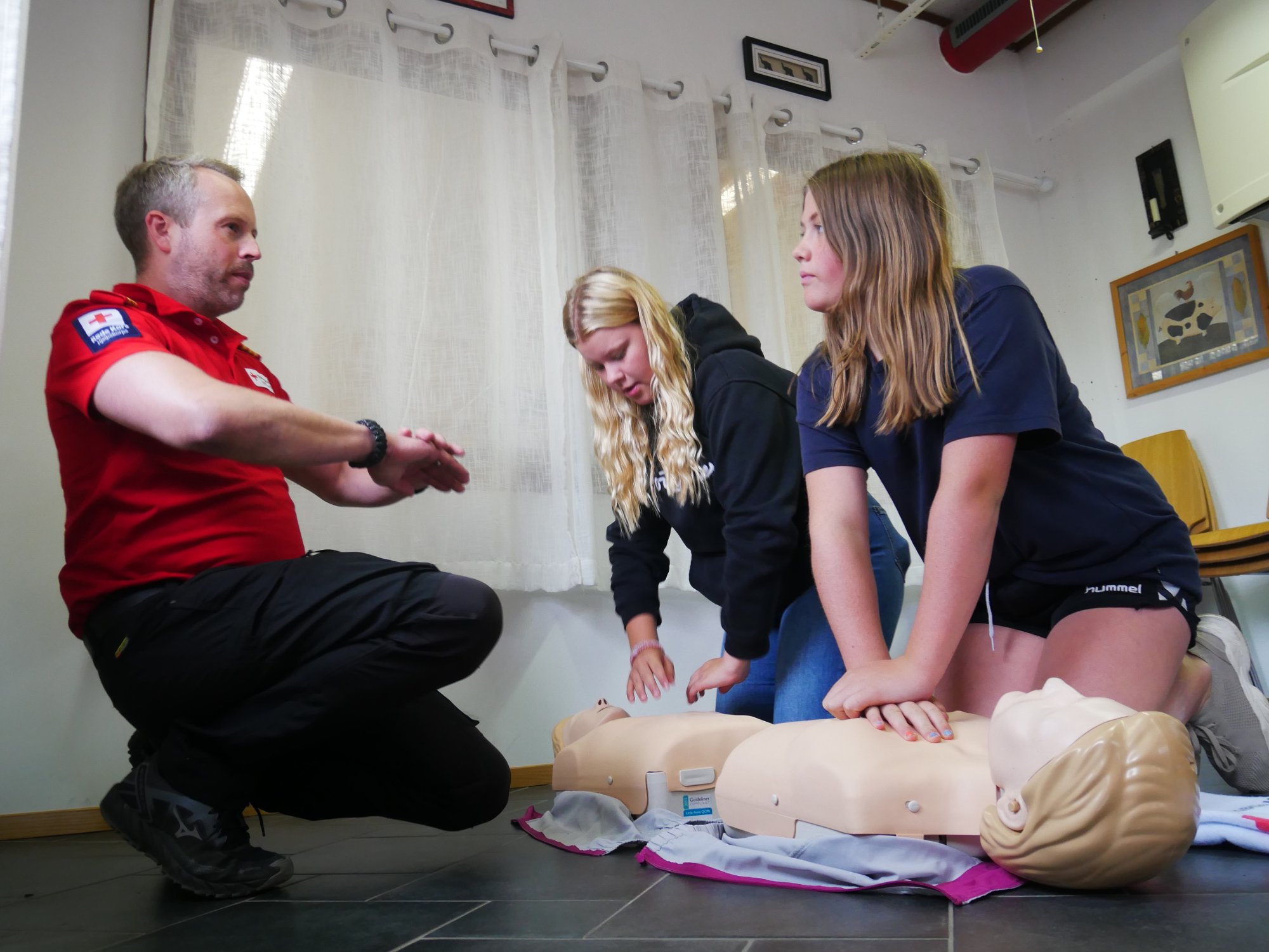 SKAL BERGA LIV: Det er Hjelpekorpset si oppgåve å berga liv, her gjev lagsleiar John Petter Svedal to unge, Celine, til venstre, og Anniken Sofie opplæring i hjarte- og lungeredning. Foto: Terje Eggum